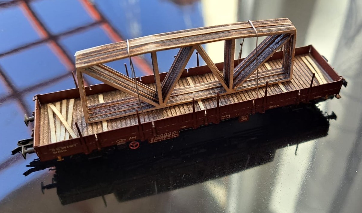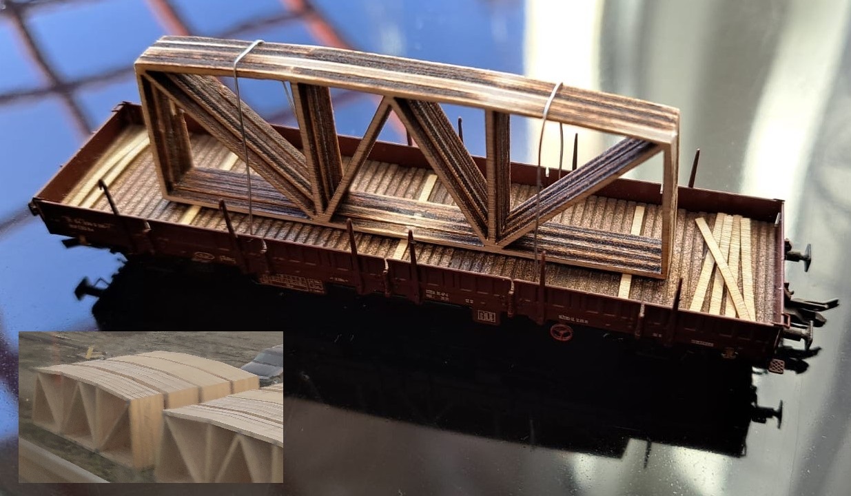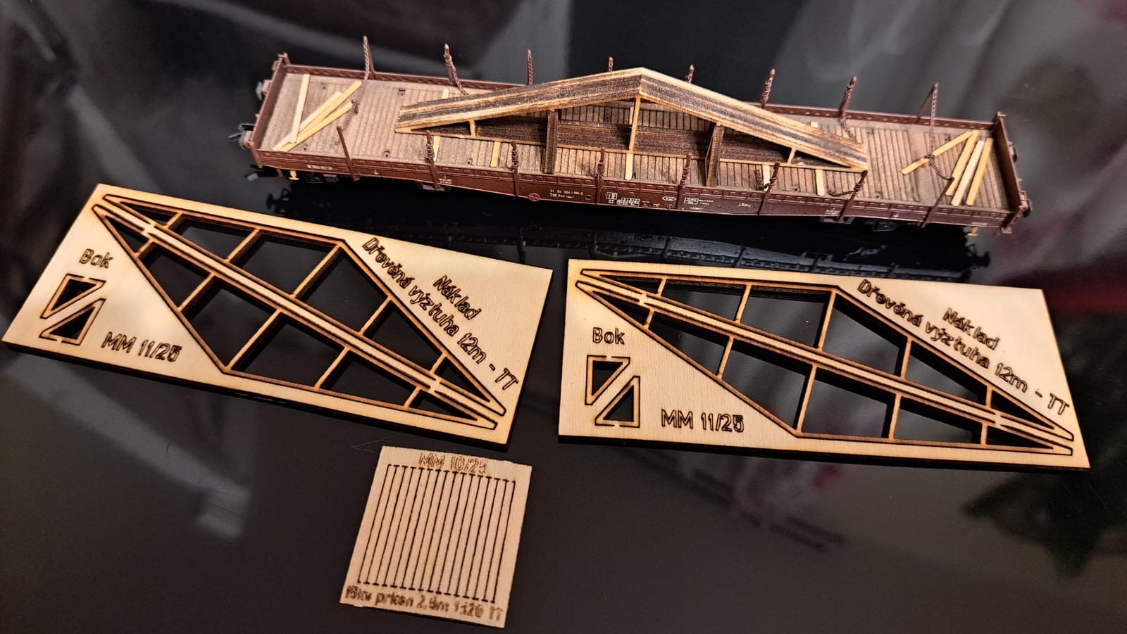 23.11.2025 - Novinka TT ( lze použít i pro N a H0 ) - Náklad do vozů, nebo do areálů fabrik, stavenišť. Dřevěné výztuhy v délce 9 metrů / v TT 7,5 cm. Sada obsahuje - 1 x aršík podložných fošen z dýhy a 2 x aršík výztuh z překližky. Cena 95 Kč. Skladem
