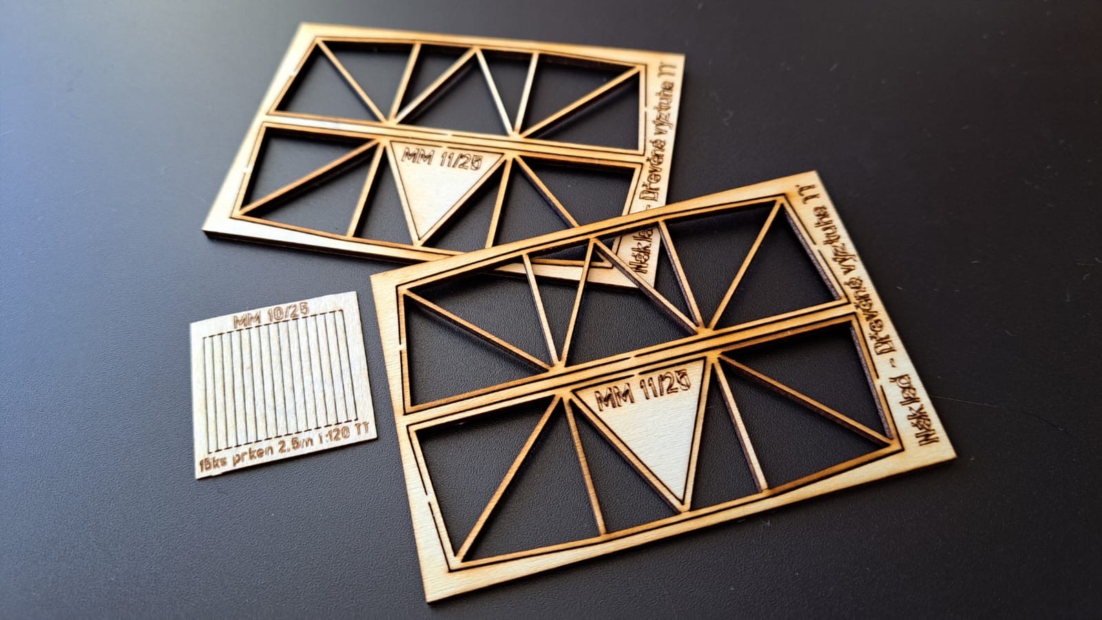 24.11.2025 - Novinka TT ( lze použít i pro N a H0 ) - Náklad do vozů, nebo do areálů fabrik, stavenišť. Dřevěné výztuhy v délce 12 metrů / v TT 10 cm. Sada obsahuje - 1 x aršík podložných fošen z dýhy a 2 x aršík výztuh z překližky. Cena 120 Kč. Skladem