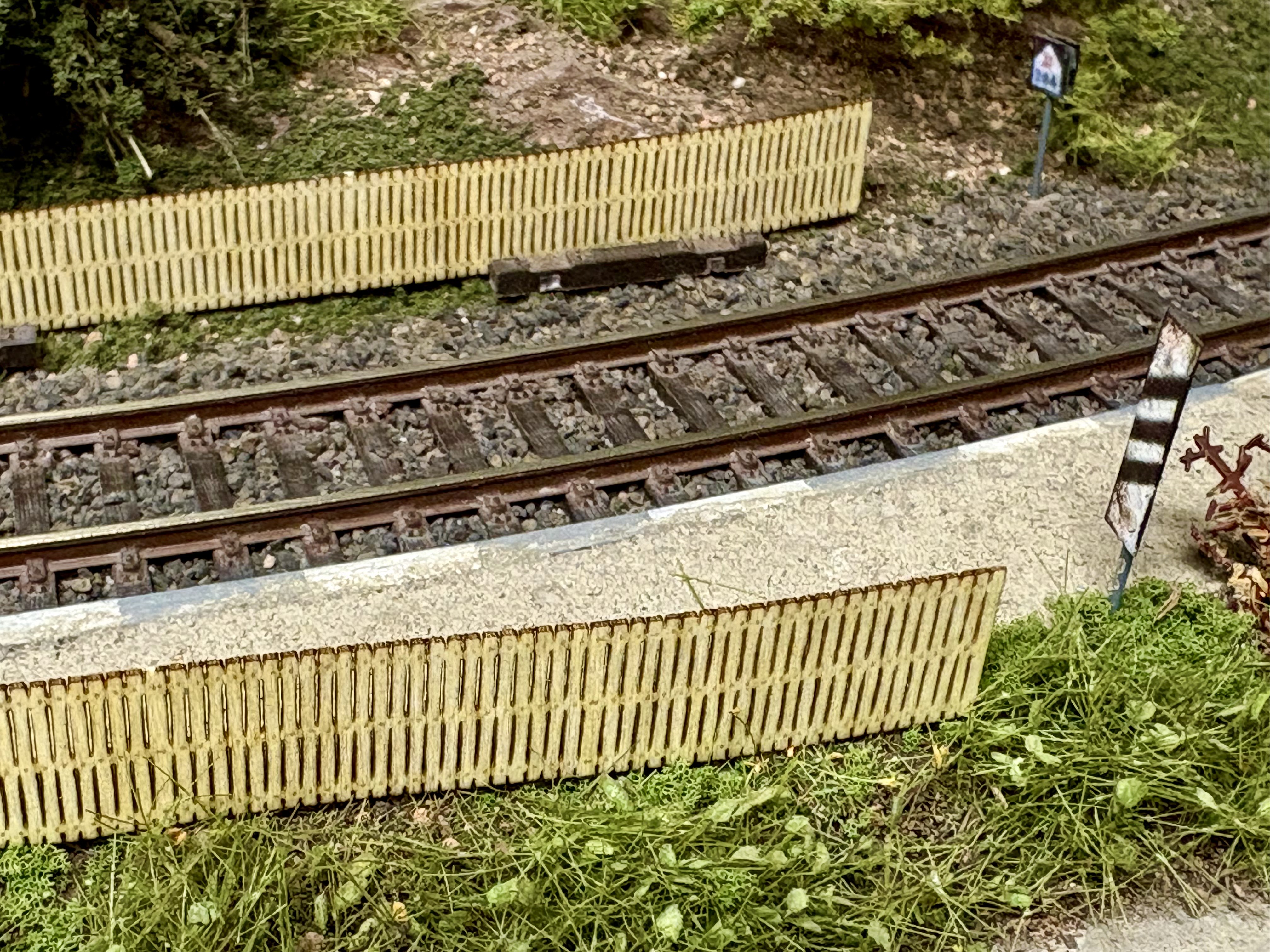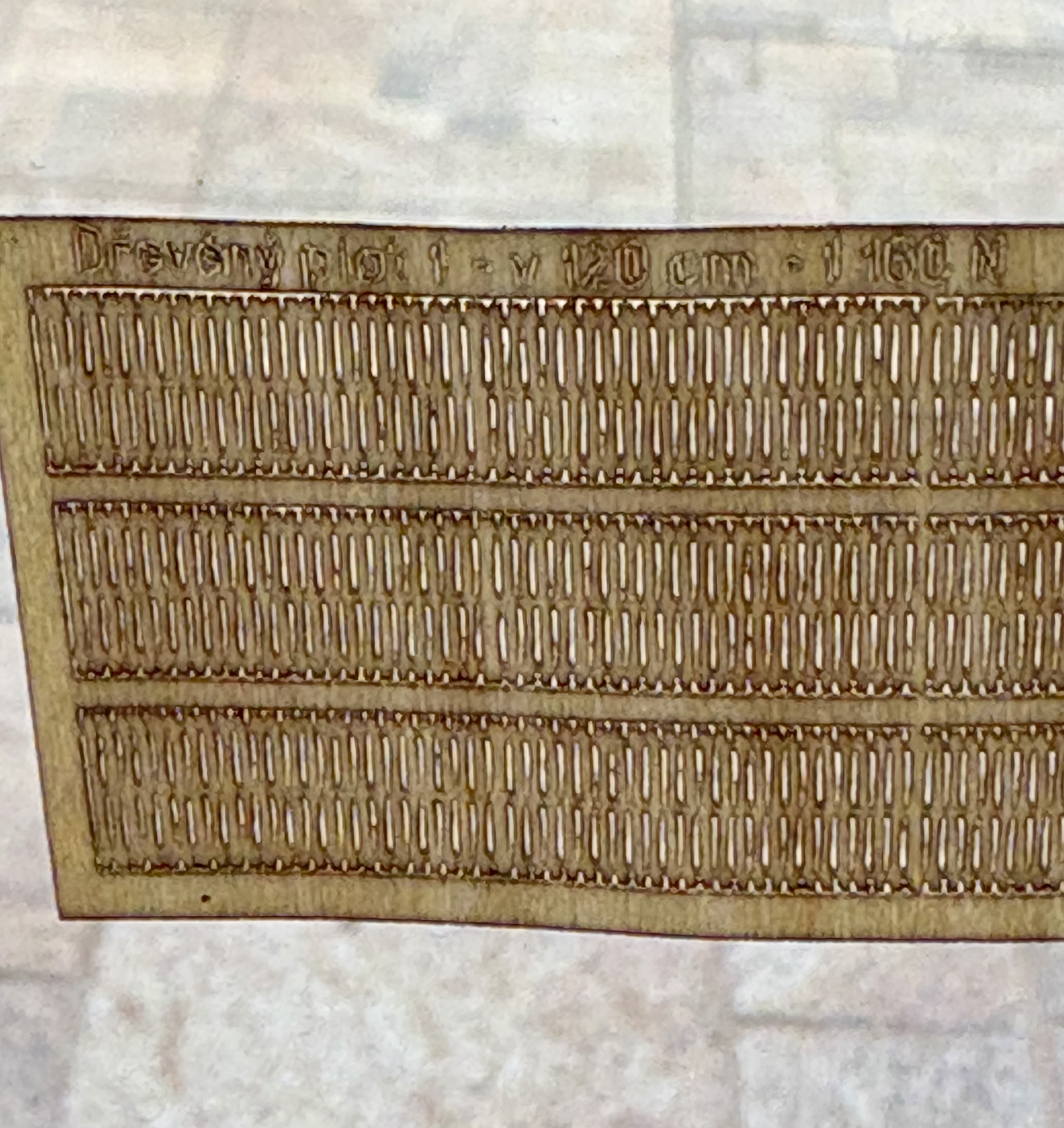 Dřevěný plot 1 - výška 120 cm, tedy v TT 1 cm, celková délka je 25 cm. Vyznačení hřebíků. Cena 75 Kč